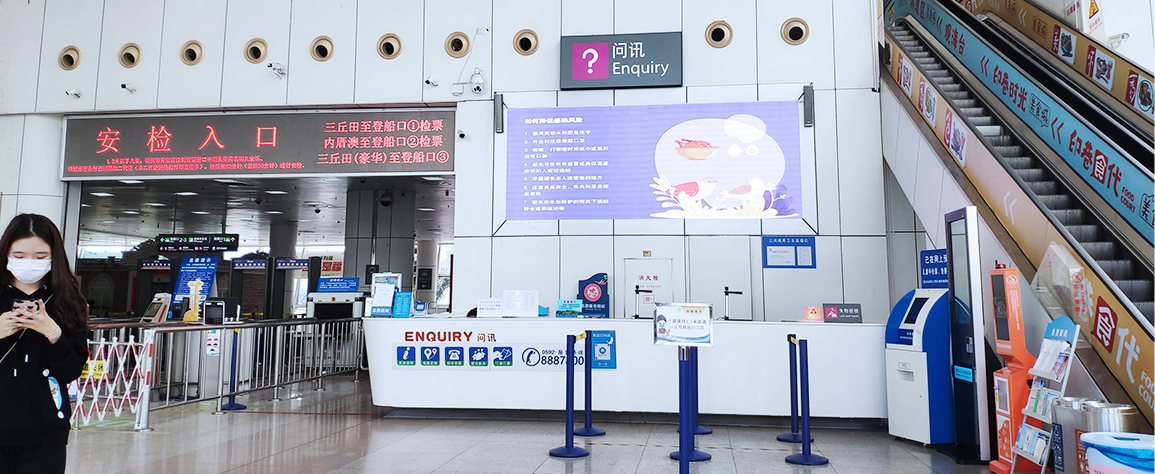 媒體位置設(shè)立于廣場/外圍,售票大廳,候船大廳,乘船通道,南北出入口等區(qū)域