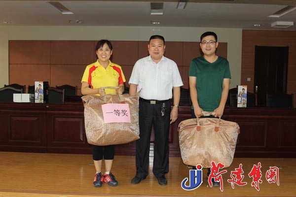 集團(tuán)總經(jīng)理苗林(中)為羽毛球比賽一等獎(jiǎng)?lì)C獎(jiǎng)