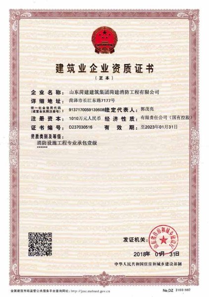 1月31日,經(jīng)山東省住房和城鄉(xiāng)建設委員會審核批準,集團消防公司順利獲得消防設施工程專業(yè)承包壹級資質(zhì),為集團公司發(fā)展壯大再添基石。