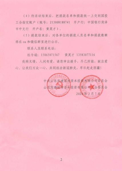 “武漢加油!菏澤加油!我捐500元。”“中國加油!山東加油!我捐1000元。”“我捐200元。”……2月7日下午,在山東菏建國有資本投資有限公司微信工作群中,一場抗擊新冠肺炎捐款活動大幕拉開,公司全體干部職工熱情高漲,積極參與,從董事長、總經(jīng)理,到每一位職工都慷慨解囊,在3天的時(shí)間內(nèi)捐款達(dá)16萬元。