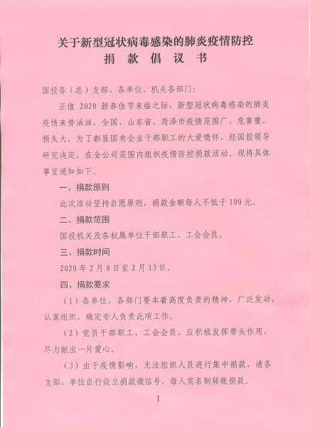 新冠肺炎疫情牽動著公司廣大干部職工的心,聞悉奮戰(zhàn)在抗擊疫情一線的醫(yī)務(wù)人員和各類工作人員防護(hù)物資緊缺的情況后,2月7日上午,國投公司黨委第一時(shí)間召開黨委會議,研究決定在全公司范圍內(nèi)組織疫情防控捐款活動,并于當(dāng)日中午通過微信工作群,發(fā)布《關(guān)于新型冠狀病毒感染的肺炎疫情防控捐款倡議書》,各單位、機(jī)關(guān)各部門積極響應(yīng),廣泛發(fā)動,認(rèn)真組織,確定專人負(fù)責(zé)此項(xiàng)工作。