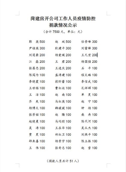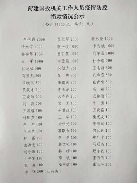 由于疫情影響,無法組織人員進(jìn)行集中捐款,公司各單位、各部門自行設(shè)立了捐款微信號,此次活動堅(jiān)持自愿原則,每人實(shí)名制轉(zhuǎn)賬捐款,彰顯了國企的責(zé)任與擔(dān)當(dāng),詮釋了菏建國投公司全體干部職工的大愛情懷。