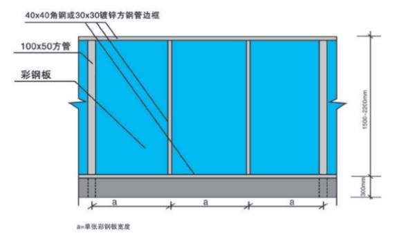 2)立柱與圍擋同高,膨脹螺栓固定,采用100*50*1.2方管,間隔3米;