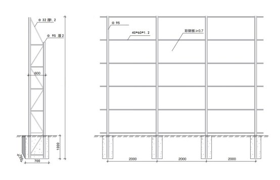 3、技術(shù)要求:圍擋高度5米,臨道路側(cè)鐵皮為綠色彩鋼瓦(約500米)、其余為藍(lán)色彩鋼瓦(約500米),彩鋼瓦厚度均為0.7mm;立柱總長(zhǎng)度6米,其中地表以上5米,深入基礎(chǔ)1米,基礎(chǔ)寬度0.7米、長(zhǎng)度0.7米,C25混凝土澆筑,立柱材質(zhì)為φ95毫米鍍鋅鋼管,間距4米;橫撐為φ32毫米鍍鋅鋼管;固定用方管尺寸為60毫米X40毫米厚鍍鋅方管,間隔1米;斜撐為60毫米X40毫米厚鍍鋅方管,間隔20米;