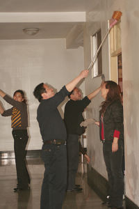 為使慶“五一”迎“五四”活動豐富多彩,二OO九年四月二十八日上午,菏建集團工會、團委和集團機關黨支部組織機關人員近四十人,集中進行了擦洗辦公樓內墻壁義務勞動。