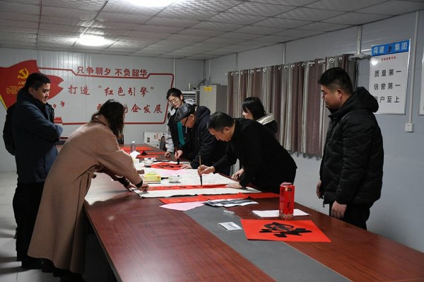 本次活動(dòng),邀請7名菏澤市知名書法家和3名公司老領(lǐng)導(dǎo)分別到菏建集團(tuán)、蘆莊施工項(xiàng)目和物業(yè)公司為職工現(xiàn)場書寫春聯(lián)和福字?;顒?dòng)現(xiàn)場氣氛熱烈,書法家們揮毫潑墨,將祝福與激情傾注筆端,融入創(chuàng)作,頃刻間,一張張紅紅火火、喜氣洋洋的福字,一幅幅寓意喜慶、滿載祝福的春聯(lián)便完成。本次活動(dòng)歷時(shí)3個(gè)小時(shí)左右,共書寫200余幅春聯(lián)和福字,得到了職工稱贊和好評。
