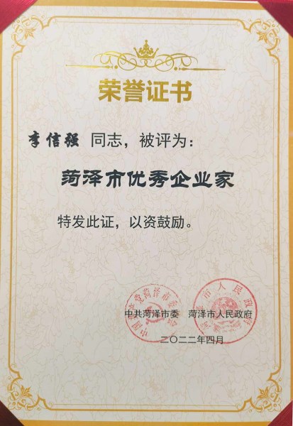 為總結(jié)成績、樹立榜樣、鼓勵先進(jìn),激勵在菏人才創(chuàng)新創(chuàng)業(yè)活力,近日,市委、市政府開展“菏澤市有突出貢獻(xiàn)的高層次人才和人才工作先進(jìn)集體”評選活動。菏建國投黨委書記、董事長李信強(qiáng)被中共菏澤市委、菏澤市人民政府評為“菏澤市優(yōu)秀企業(yè)家”。