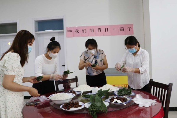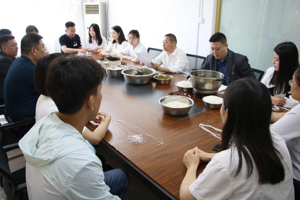 菏建教育公司開展了包粽子活動。活動現(xiàn)場提前準備好了糯米、粽葉、紅棗。從未包過粽子的“年輕人”虛心向“老師傅”學(xué)習(xí)請教,在認真學(xué)習(xí)了選葉、折葉、盛料、壓實、裹葉、扎繩等包粽子的步驟后,大家圍站在一起,紛紛上手、互幫互學(xué)。只見一雙雙巧手上下?lián)]動,一片片粽葉、一粒粒糯米,在大家手中,變成了香甜可口的粽子,整個活動現(xiàn)場洋溢著歡聲笑語。