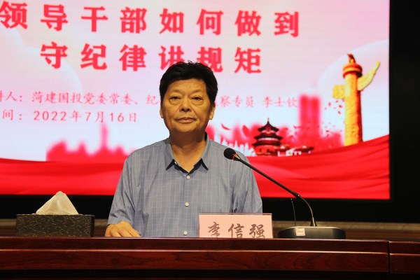 7月16日上午,菏建國投黨委常委、紀(jì)委書記、監(jiān)察專員李士欽以“領(lǐng)導(dǎo)干部如何做到守紀(jì)律講規(guī)矩”為主題,為公司黨員干部上了一堂生動(dòng)的廉政專題黨課。菏建國投黨委書記、董事長李信強(qiáng)主持會(huì)議。菏建國投領(lǐng)導(dǎo)班子全體,國投機(jī)關(guān)中層副職及以上同志、全體黨員,菏建集團(tuán)領(lǐng)導(dǎo)班子全體、各處室負(fù)責(zé)人、權(quán)屬各單位主要負(fù)責(zé)人,國投各權(quán)屬單位領(lǐng)導(dǎo)班子全體同志參加會(huì)議。