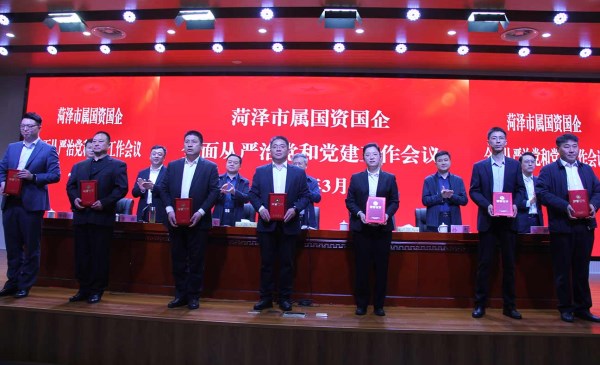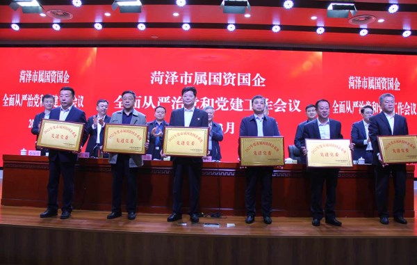 ![]() 菏建國投黨委書記、董事長李信強(前排左三)領取“先進黨委”獎 |