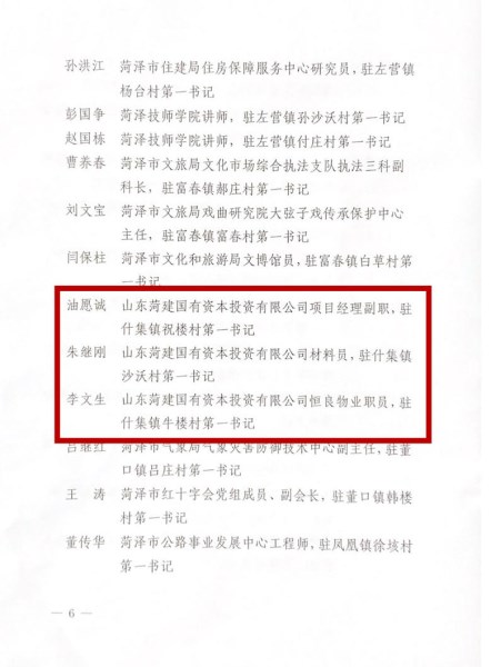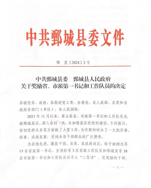 近日,中共鄄城縣委、鄄城縣人民政府發(fā)布關(guān)于獎(jiǎng)勵(lì)省、市派第一書記和工作隊(duì)員的決定,菏建國(guó)投選派第一書記油愿誠(chéng)、朱繼剛、李文生等三名同志榮獲個(gè)人“三等功”。