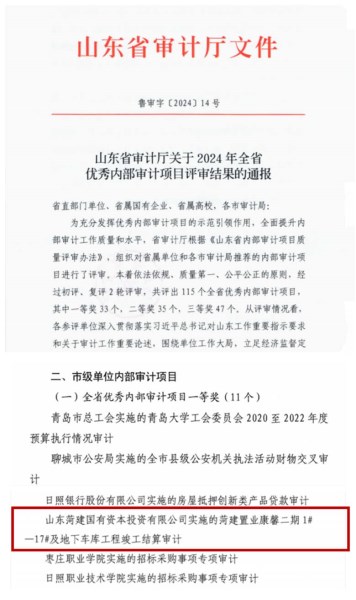 近日,山東省審計(jì)廳組織對(duì)省屬單位和各市審計(jì)局推薦的內(nèi)部審計(jì)項(xiàng)目進(jìn)行了評(píng)審,經(jīng)過(guò)初評(píng)、復(fù)評(píng)2輪嚴(yán)格評(píng)審,菏建國(guó)投申報(bào)的《菏建置業(yè)康馨二期1#-17#及地下車(chē)庫(kù)工程竣工結(jié)算審計(jì)》項(xiàng)目,在眾多參評(píng)項(xiàng)目中脫穎而出,榮獲2024年度市級(jí)單位內(nèi)部審計(jì)項(xiàng)目“全省優(yōu)秀內(nèi)部審計(jì)項(xiàng)目一等獎(jiǎng)”,是我市市級(jí)單位唯一獲得一等獎(jiǎng)的內(nèi)部審計(jì)項(xiàng)目。