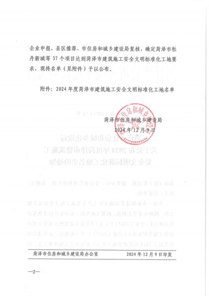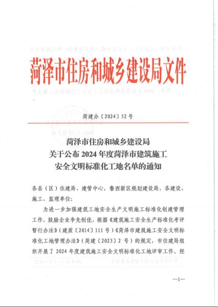 近日,菏澤市住房和城鄉(xiāng)建設(shè)局傳來喜訊,由菏建集團承建的東方樾府A區(qū)二標(biāo)段A7#、A8#、A9#、A10#、A15#、A16#、A17#、A18#樓和西城府邸B區(qū)1#樓、2#樓、17#樓項目,經(jīng)過嚴(yán)格審查與綜合考量,從眾多參選單位中脫穎而出,榮獲2024年度“菏澤市安全文明標(biāo)準(zhǔn)化工地”。