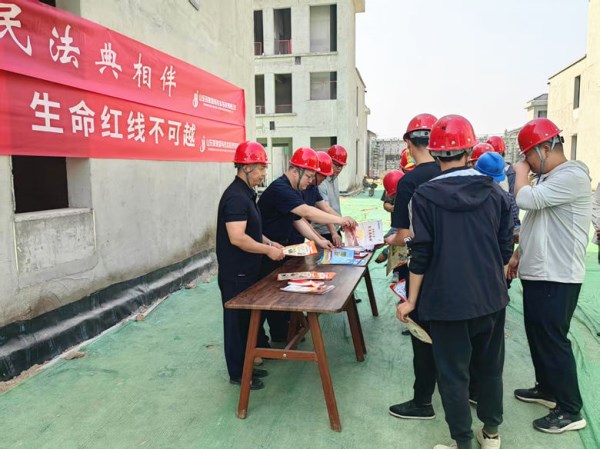在項(xiàng)目一線向建筑工人宣傳《民法典》《安全生產(chǎn)法》相關(guān)法律知識(shí)