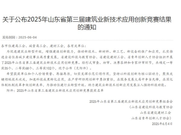 近日,由省建設(shè)科技與教育協(xié)會(huì)、省建設(shè)建材工會(huì)、省青年創(chuàng)新人才協(xié)會(huì)聯(lián)合主辦的2025年山東省第三屆建筑業(yè)新技術(shù)應(yīng)用創(chuàng)新競(jìng)賽評(píng)審會(huì)在濟(jì)南順利舉行。菏建集團(tuán)申報(bào)的菏澤市直初中(天香學(xué)校)項(xiàng)目榮獲二等獎(jiǎng),清菏園擴(kuò)建項(xiàng)目榮獲三等獎(jiǎng)。