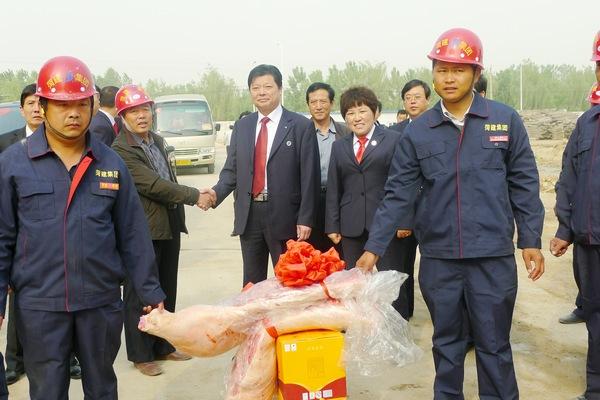 演出之前,總經(jīng)理李信強(qiáng)等集團(tuán)領(lǐng)導(dǎo)為奮戰(zhàn)在濱河春天工地的施工人員送去了豬肉、酒類等慰問(wèn)品。