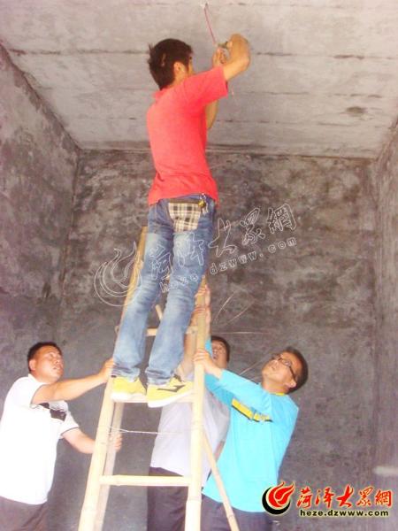 在為閆玉娥家安裝電線的時(shí)候,高剛垛(右二)也刻意躲避著鏡頭。