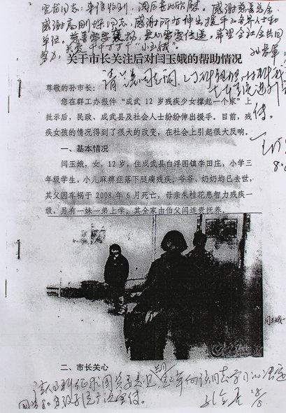 在此之前,閆玉娥的事跡自今年3月份在菏澤大眾網(wǎng)、《菏澤日報(bào)》、《牡丹晚報(bào)》上報(bào)道以來,就引起市委、市政府領(lǐng)導(dǎo)及社會各界的關(guān)注。市委書記趙潤田批示要求成武縣盡快為閆玉娥一家辦理低保,孫愛軍市長一直很關(guān)心閆玉娥的遭遇和病情,對此,3月23日專門做出批示進(jìn)行救助,6月26日,在得知孩子術(shù)后平安返回菏澤的喜訊后,孫市長欣慰地告訴大眾網(wǎng)記者“感謝社會各界好心人,感謝大眾網(wǎng)!”市政府黨組副書記、特邀咨詢高木斗同志批示“請彩云市長、士三、愛華同志辦理”,市民政局局長李士三批示“請愛華局長抓好落實(shí)”,市民政局、市慈善總會趕赴閆玉娥家中,將其納入我市慈善救助最高標(biāo)準(zhǔn)——“周行一善”救助項(xiàng)目,給予其家庭5000元的救助,并決定從2012年起,將其全家納入低保保障范圍。