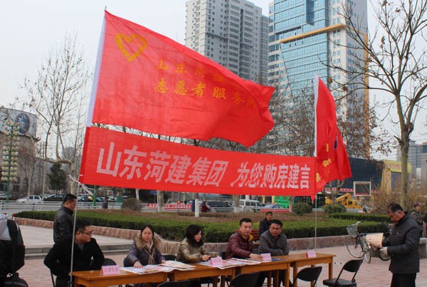 此次活動(dòng),集團(tuán)以“山東菏建集團(tuán)為您購(gòu)房建言”為主要內(nèi)容,共展開涉及“購(gòu)房咨詢、裝飾咨詢、房屋質(zhì)量咨詢、法律咨詢”等多個(gè)方面知識(shí)宣傳。三月的花都還是冷風(fēng)刺骨,集團(tuán)志愿者以專業(yè)的態(tài)度積極向過往的行人講解房屋相關(guān)知識(shí),盡心盡力做好服務(wù)闡述雷鋒時(shí)代精神,用實(shí)際行動(dòng)展示出菏建人良好的社會(huì)形象。