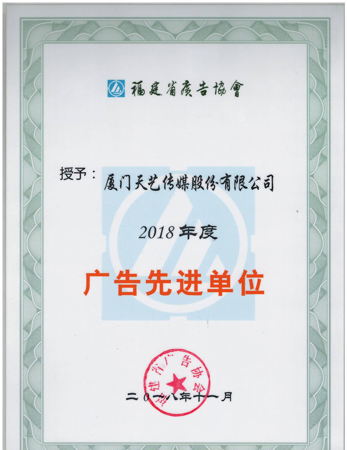 2018年福建省廣告界在推動廣告業(yè)發(fā)展中,勇于開拓,努力創(chuàng)新,取得了優(yōu)異的成績,為福建經(jīng)濟發(fā)展和社會進(jìn)步作出了巨大貢獻(xiàn),涌現(xiàn)了一批先進(jìn)單位。為了表彰先進(jìn),樹立典型,推動工作,再創(chuàng)輝煌,福建省廣告協(xié)會于12月20日舉辦了第七屆第三次理事會,并授予了廈門市天藝傳媒股份有限公司“福建省廣告先進(jìn)單位”的稱號。